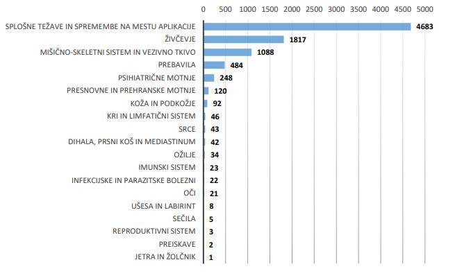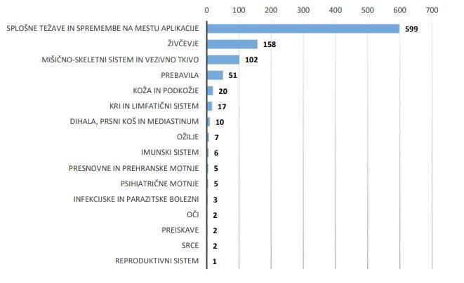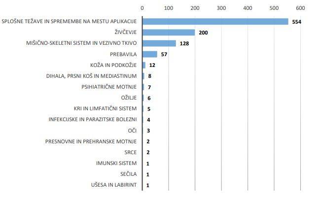 Inštitut prijavljene neželene učinke razvršča po organskih sistemih na način, ki ga uporablja Evropska agencija za zdravila.