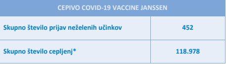 Cepljenje se je s cepivom Janssen začelo v zadnjem tednu aprila. Do 26. septembra so na inštitutu zabeležili prijavo 452 neželenih učinkov. V tem obdobju je bilo v Sloveniji izvedenih 118.978 cepljenj s cepivom Janssen.