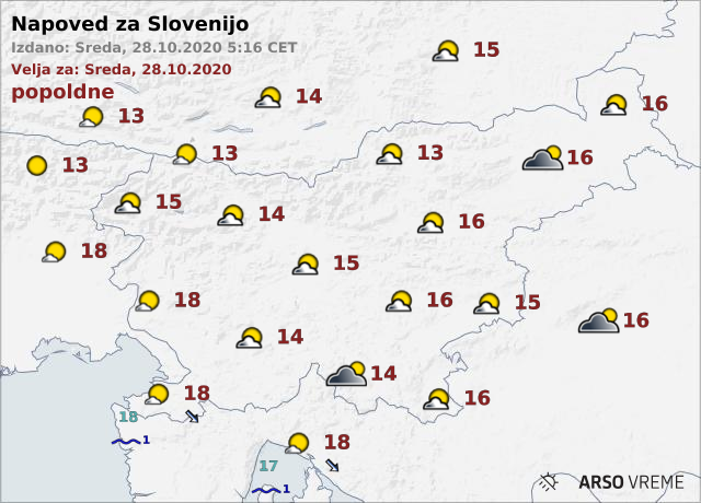 Danes, 28. oktobra 2020, bo po napovedih meteorologov Agencije Republike Slovenije za okolje delno jasno z zmerno oblačnostjo. Po nižinah v notranjosti bo zjutraj in dopoldne še oblačno ali megleno.