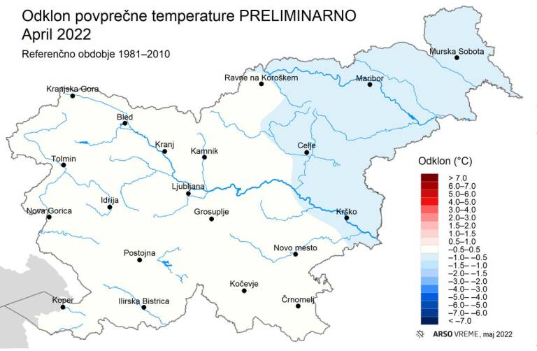 Odklon temperature zraka od povprečja je znašal –0,4 stopinje Celzija. To uvršča april 2022 približno na sredino porazdelitve od leta 1961.