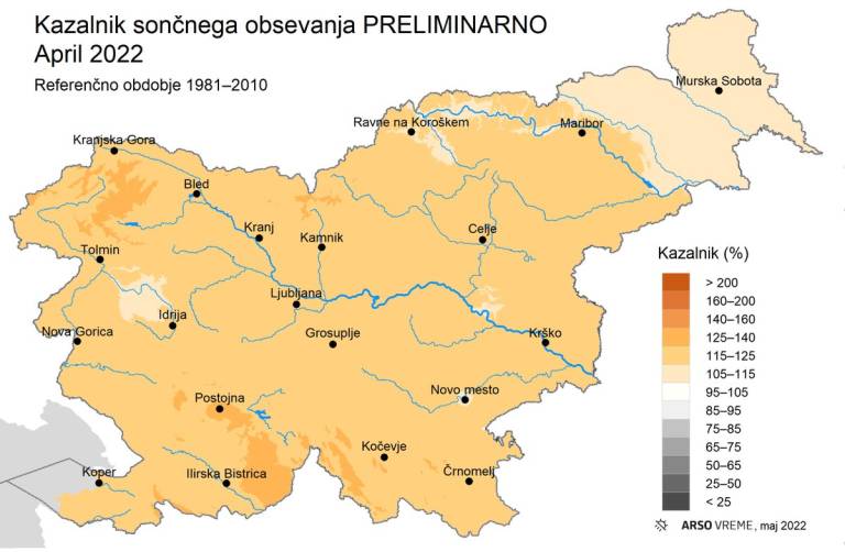 Kazalnik trajanja sončnega obsevanja glede na primerjalno obdobje 1981–2010 je znašal 119 odstotkov, kar uvršča letošnji april med deset najbolj osončenih po letu 1961.