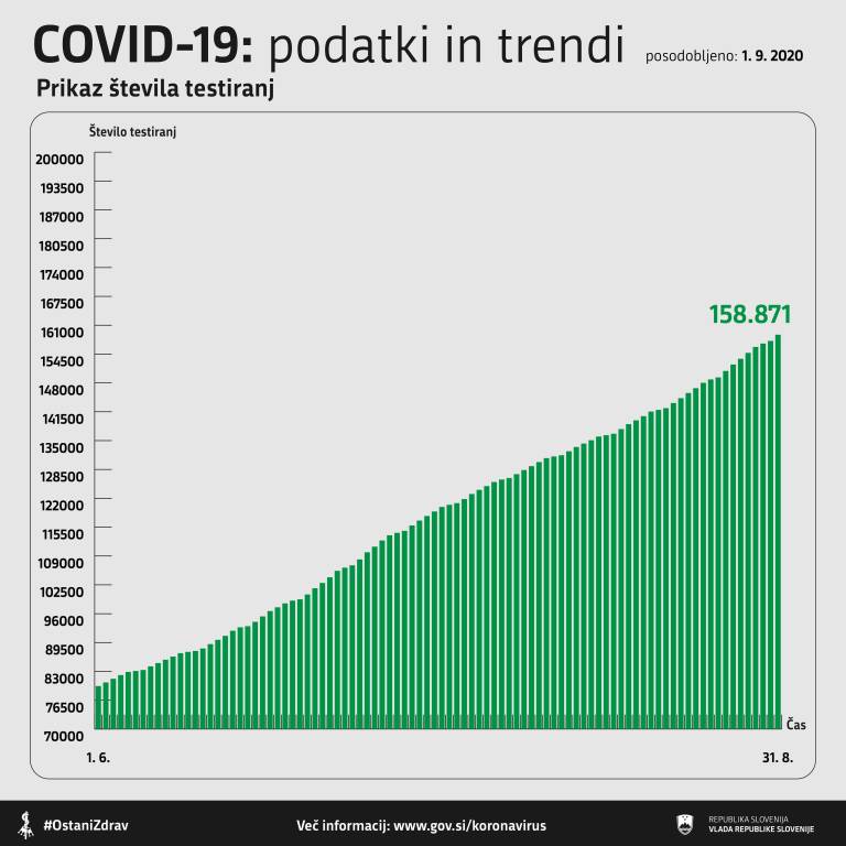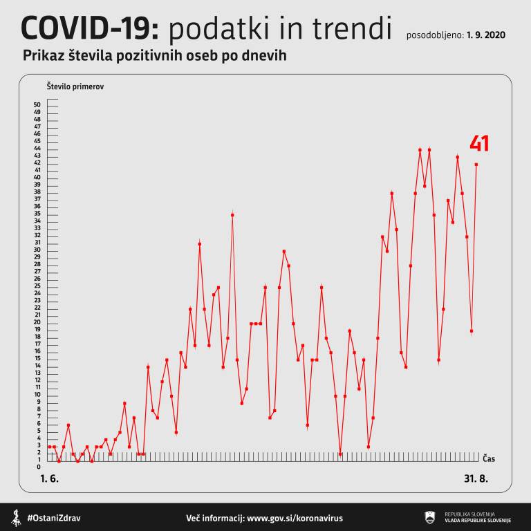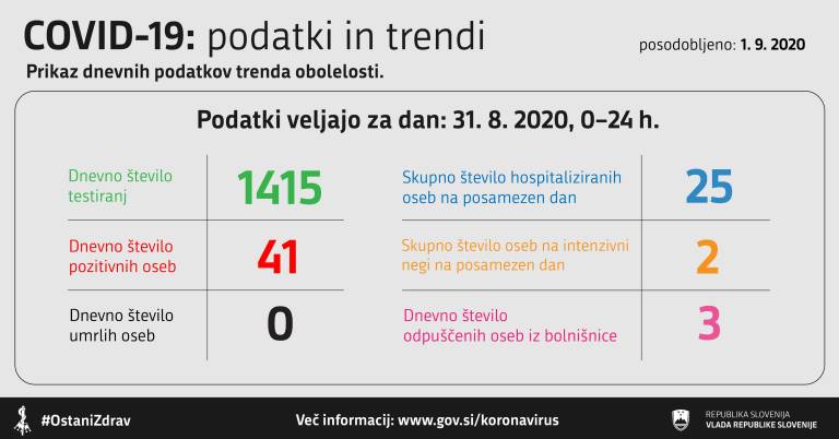 V Sloveniji so včeraj, 31. avgusta, opravili 1415 testiranj na novi koronavirus. Potrdili so 41 novih okužb.
