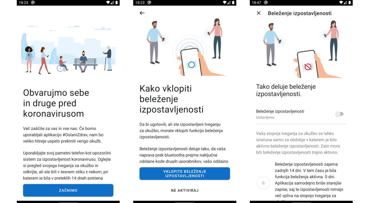 Aplikacijo si bomo lahko uporabniki prostovoljno prenesli iz App Store in Google Play trgovine. Pozdravno okno nas bo nagovorilo, kako se aplikacija uporablja, povedalo nam več o pogojih uporabe ter predstavilo, kako se aktivira beleženje izpostavljenosti.
