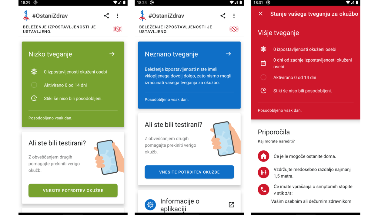 Kot je povedal Cigoj, so v aplikaciji 3 stopnje tveganja. Zelena označuje nizko tveganje, modra ponazarja nepoznano stanje, ko se še ne pozna znanje tveganja. Rdeča barva pa označuje višje tveganje, torej višjo izpostavitev z okuženimi uporabniki.