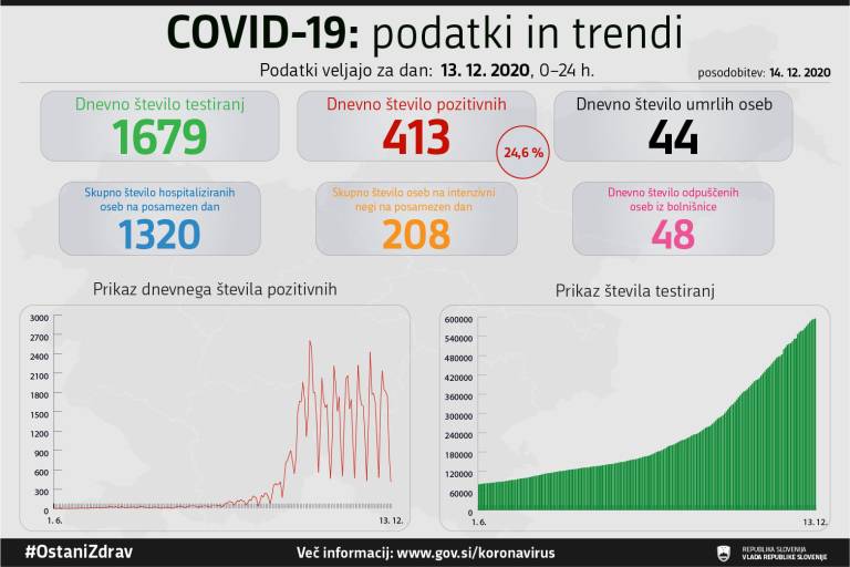 V Sloveniji so v včeraj, 13. decembra, opravili 1679 testiranj na koronavirus in potrdili 413 novih okužb. To pomeni, da je bil delež pozitivnih testov tokrat 24,6-odstoten.