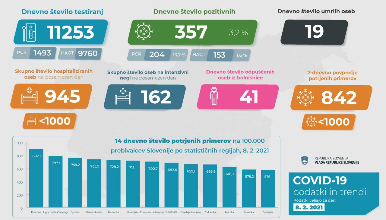 V Sloveniji so včeraj, 7. februarja, opravili 11.253 testiranj na koronavirus in potrdili 357 novih okužb, gre za 3,2-odstotni delež okužb.