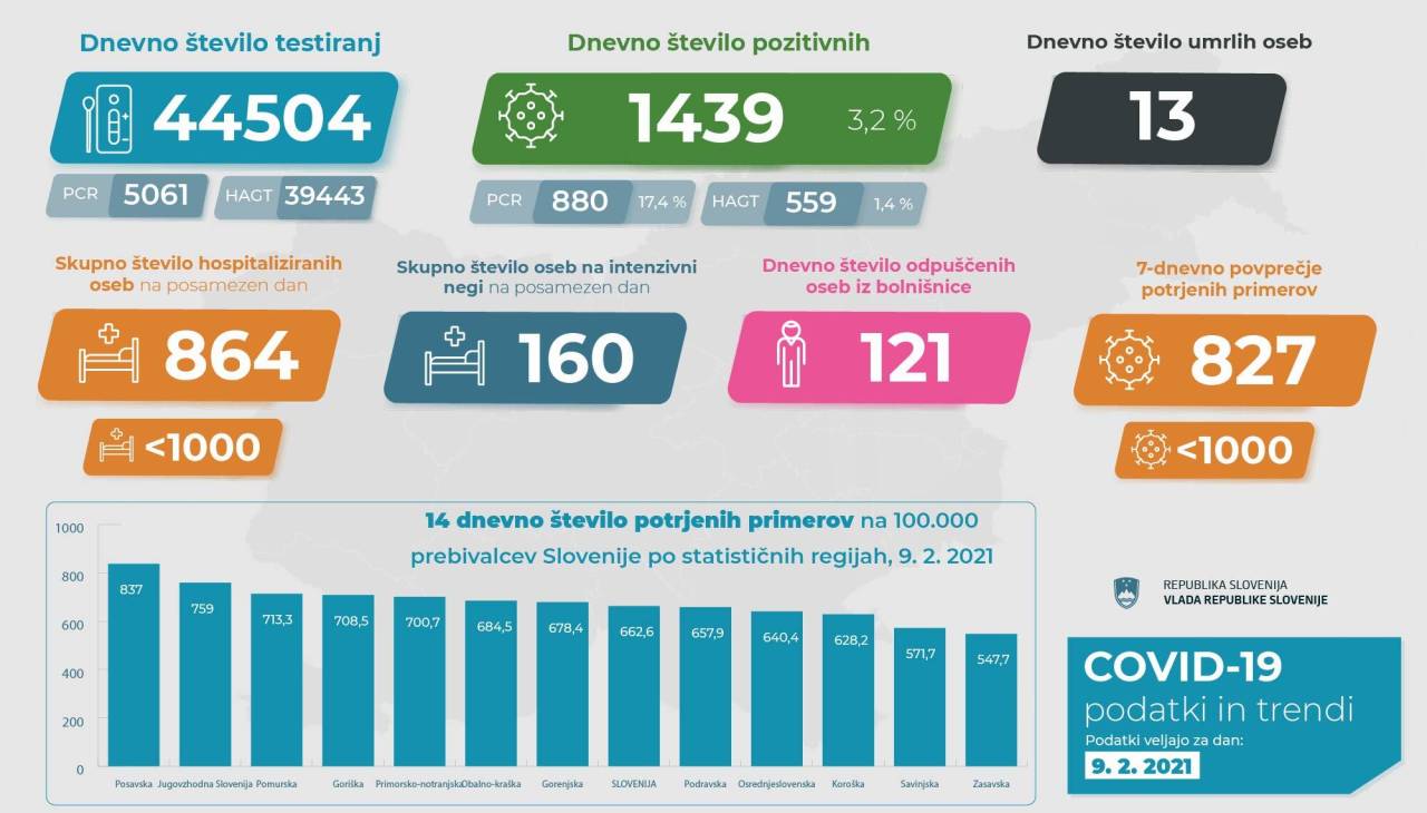 V Sloveniji so včeraj, 9. februarja, opravili 44.504 testiranj na koronavirus in potrdili 1439 novih okužb, gre za 3,2-odstotni delež okužb.