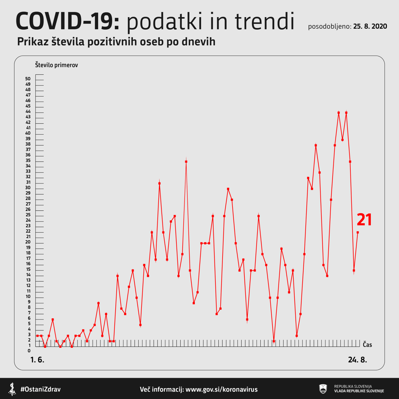 V Sloveniji so včeraj, 24. avgusta, opravili 1370 testiranj na novi koronavirus. Potrdili so 21 novih okužb. Za primerjavo. Dan prej so potrdili 14 novih okužb ob 543 opravljenih testiranjih.