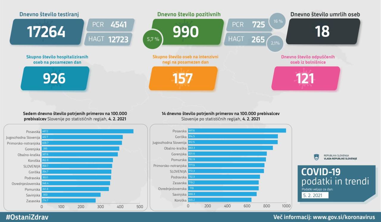 V Sloveniji so včeraj, 5. februarja, opravili 17.264 testiranj na koronavirus in potrdili 990 novih okužb, gre za 5,7-odstotni delež.