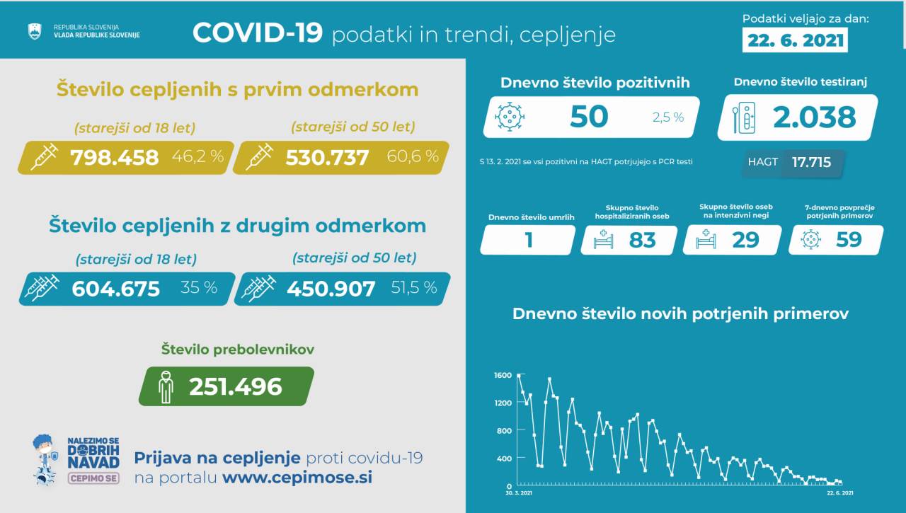 V Sloveniji so včeraj, 22. junija, opravili 2038 PCR testiranj na koronavirus in potrdili 50 novih okužb, gre za 2,5-odstotni delež okužb.
