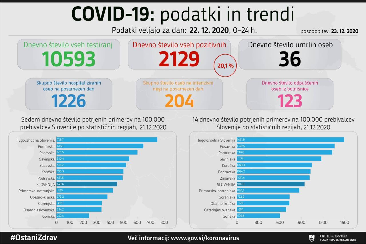 V Sloveniji so včeraj, 22. decembra, opravili 10593 testiranj na koronavirus in potrdili 2129 novih okužb. To pomeni, da je bil delež pozitivnih testov tokrat 20,1-odstoten.