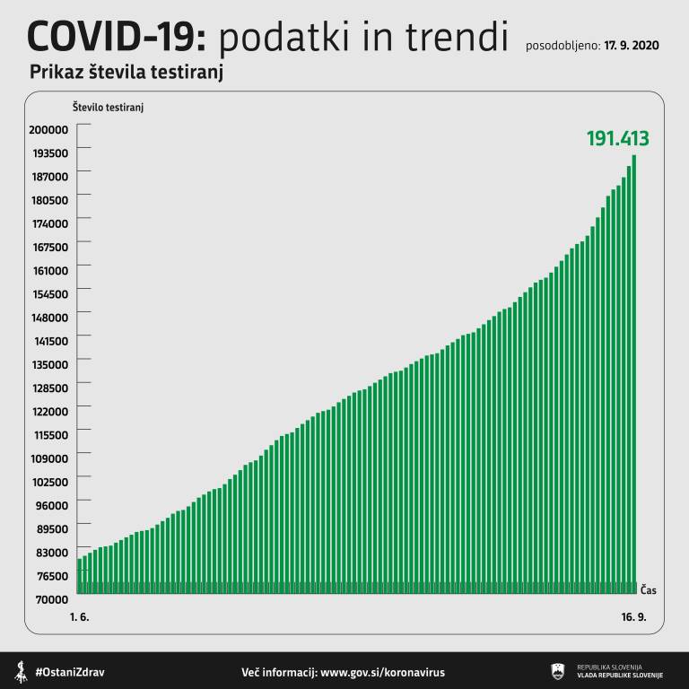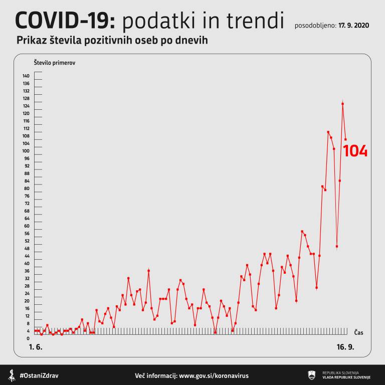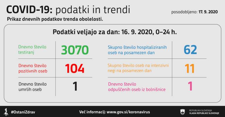V Sloveniji so včeraj, 16. septembra 2020, opravili 3070 testiranj na novi koronavirus. Potrdili so 104 nove okužbe. Za primerjavo: dan prej so ob 3123 testiranjih potrdili rekordnih 123 novih okužb s koronavirusom.