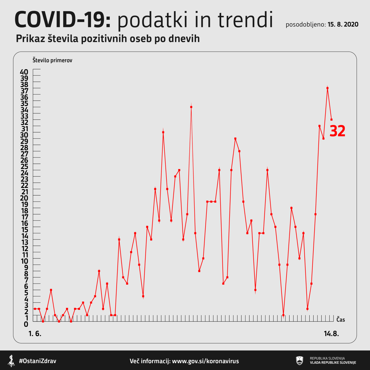 Včeraj, 14. avgusta 2020, so v Sloveniji opravili 1034 testiranj na okužbo s koronavirusom. Pri tem so potrdili 32 novih okužb. Za primerjavo, dan pred tem je bilo ob 937 testiranjih 37 pozitivnih primerov.