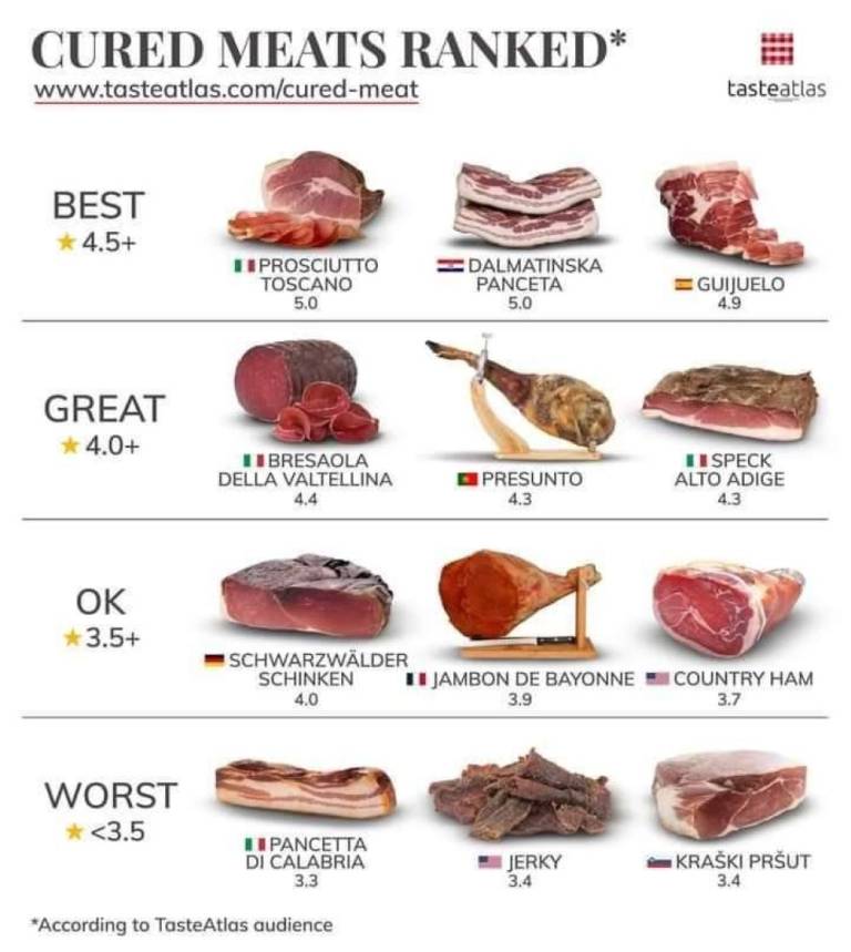 Na prvem mestu z oceno 4.8 in petimi zvezdicami je španski Jamón 100% ibérico de bellota, na drugem z oceno 4.7 prav tako španski Jamón ibérico de bellota. Na petem mestu je italijanski Prosciutto di Parma z oceno 4.6, Prosciutto San Daniele je na 9 mestu z oceno 4.5. Na 12. mestu je črnogorska Njeguška pršuta z oceno 4.5, na 18. mestu je dalmatinski pršut z oceno 4.4.