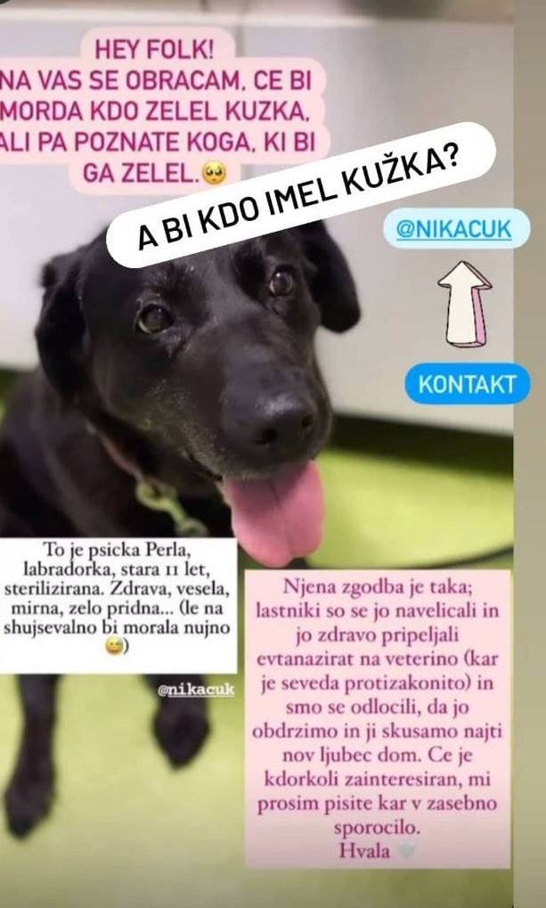 Kot je bilo moč razbrati iz objav, je njena zgodba precej žalostna, a kot vse kaže se ji le nasmiha srečen konec. 11-letna psička Perla, pasme labradorec, je bila na Veterino v Logatec pripeljana tik pred novim letom z namenom evtanazije, saj so jo lastniki zaradi družinskih okoliščin želeli uspavati. A ker gre za zdravega psa, evtanazije na kliniki niso opravili, saj je pri nas le-ta protizakonito.