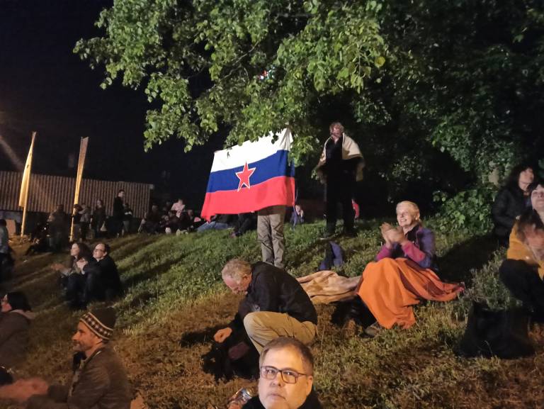 Nazadnje je po koncu oddaje Štefančič stopil še pred množico ljudi, ki je dogajanje spremljala zunaj gledališča, in ji namenil pozdrav: »Žal mi je, da nismo tega naredili v Stožicah. Žal mi je, da niste prišli vsi noter. Noter smo spravili kolikor se je dalo ljudi. Upam, da ste Roberta Goloba kaj razumeli. Žižek je 'peace of cake'. Žižka razume vsak. Žurerite. Notri je žurka naprej, ne vem, če je tudi zunaj kaj. Jaz sem vas prišel samo pozdraviti. Najlepša hvala, ker ste prišli.«