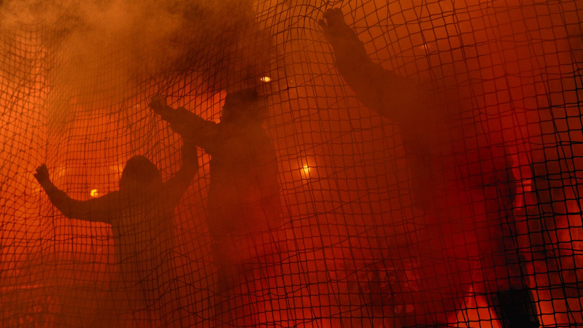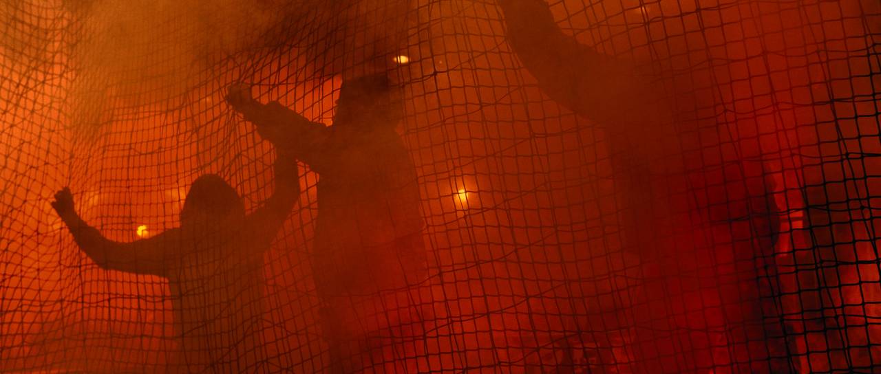Nato pa - bum. Velika skupina zamaskirancev na svoji, od očetov, mamic, dedkov, babic, otrok in ostale splošne populacije ločeni tribuni z glasnim skandiranjem, transparenti in predvsem pirotehničnimi sredstvi atmosfero na stadionu v hipu spremeni v pravo vojno stanje.