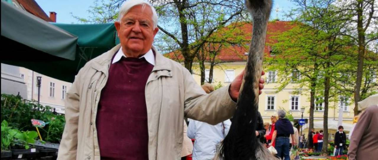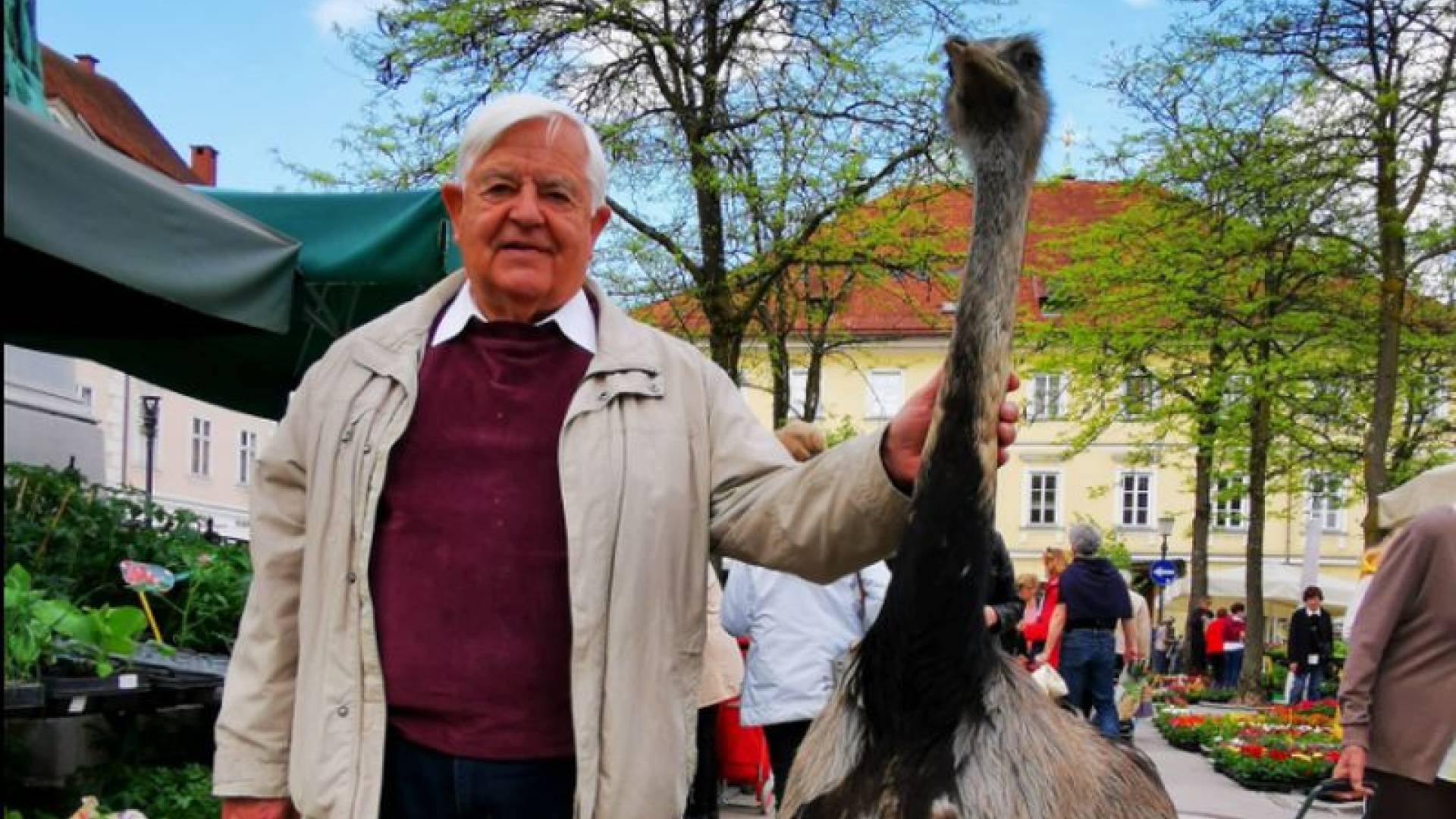 V eni roki domači pridelki, v drugi nandu. Milana Kučana so na tržnici v objektiv ujeli v družbi nanduja.