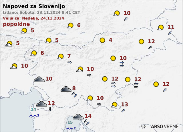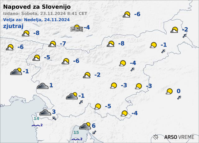 Jutri bo vreme še nekoliko bolj razgibano. Dopoldne bo večinoma delno jasno, a se bo na Primorskem in Notranjskem že zjutraj začelo oblačiti. Popoldne bo čutiti jugozahodni veter, ki bo prinesel nekaj dinamike v zračne tokove. Jutranje temperature bodo povsod zimsko nizke – od -8 do -1 stopinj Celzija, le na Primorskem bo malce mileje, okoli 3 stopnije Celzija. Čez dan bo na severu Slovenije do 5 stopinj Celzija, drugod pa prijetnejših 8 do 13 stopnij Celzija.