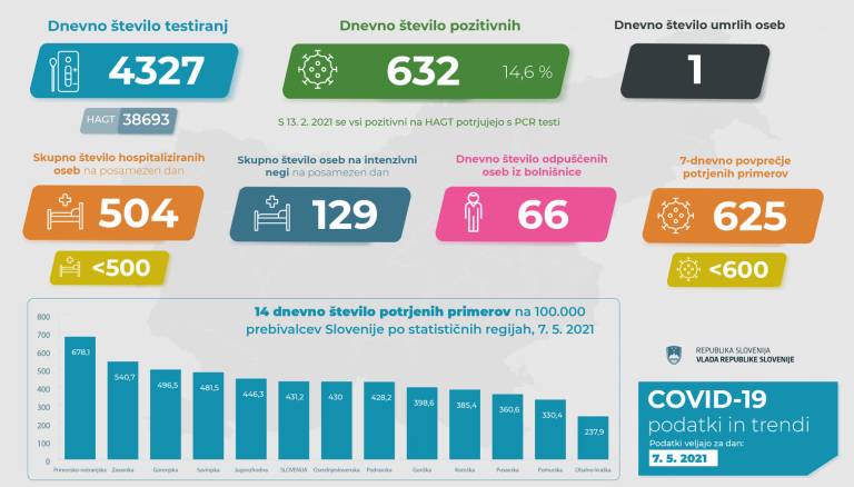 V Sloveniji so včeraj, 7. maja, opravili 4327 PCR testiranj na koronavirus in potrdili 632 novih okužb, gre za 14,6-odstotni delež okužb. Aktivnih primerov je po podatkih Covid-19 Sledilnika trenutno 9116.