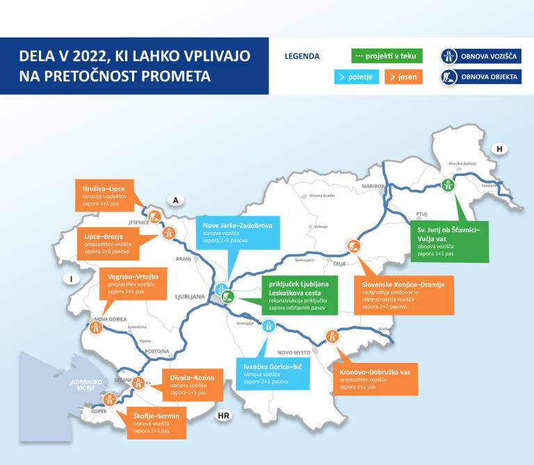 Kot so pojasnili na Dars, v letu 2022 načrtujejo devet novih obsežnejših obnovitvenih del na avtocestnem omrežju. Obnov bo poleti nekoliko manj kot običajno, začetek večine del namreč načrtujejo za jesenski čas.