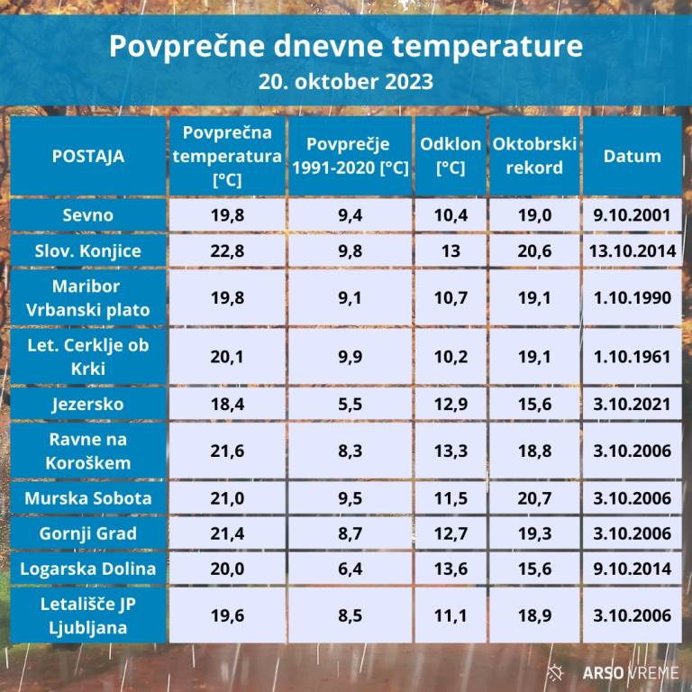 Pred dnevi je bil na vsaj 20 meteoroloških postajah dosežen rekord v povprečni dnevni temperaturi. Odkloni so na večini postaj presegli 10 stopinj Celzija, v Dobličah je bil odklon presežen kar za 14,5 stopinje Celzija. Tam so tudi zabeležili oktobrski temperaturni rekord – povprečna dnevna temperatura je bila 24,9 stopinje Celzija.