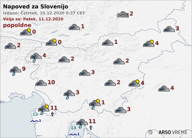 V južnih in zahodnih krajih lahko nastanejo manjše plohe. Najvišje dnevne temperature bodo od 0 do 4, na Primorskem se bo ogrelo do 10 stopinj Celzija.