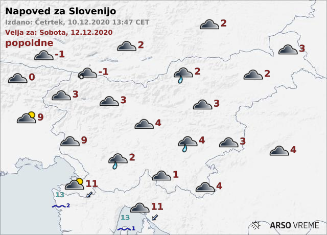 Oblačno vreme se bo nadaljevalo tudi v soboto. Možne bodo rahle plohe. Temperature se bodo povzpele do največ 4 stopinje nad ničlo.