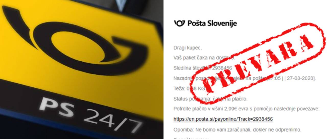 Nepridipravi pošiljajo lažna elektronska sporočila, v katerih zlorabljajo celostno grafično podobo Pošte Slovenije. Svoje 'žrtve' v sporočilu obveščajo, da jih čaka paket, za katerega je treba plačati manjšo poštnino, gre pa seveda za prevaro.