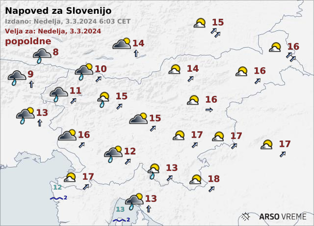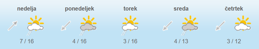 Najvišje dnevne temperature bodo od 12 do 18, v severozahodni Sloveniji okoli 10 stopinj Celzija.