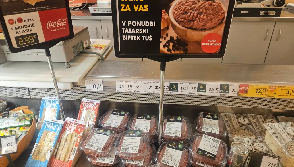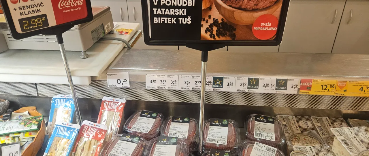 Cene se precej razlikujejo. Tako je ta mesni namaz, ki ga prodaja Hofer, dostopen že za 15,96 evra za kilogram, medtem ko biftek v Mercatorju stane 29,95 evra za kilogram.