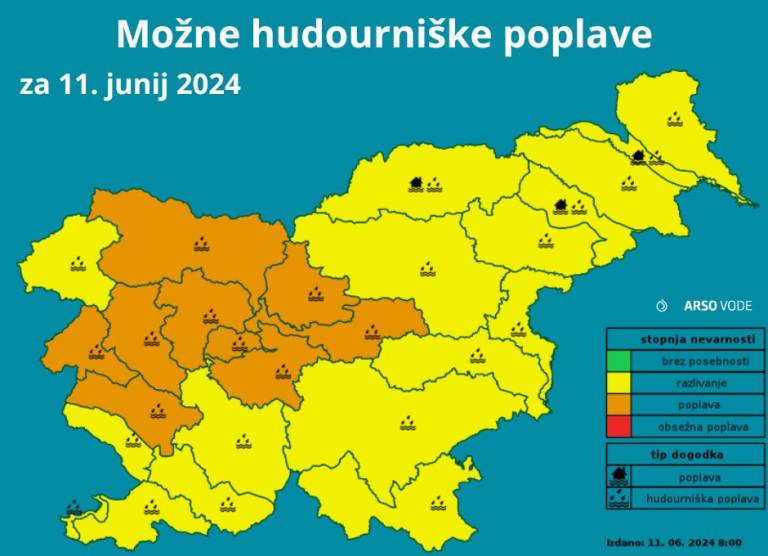 Dopoldan bodo reke še naraščale, ob krajevnih plohah in nevihtah lahko hitro narastejo posamezni manjši vodotoki in hudourniki več delih države, ki lahko poplavijo, poplavi lahko tudi padavinska voda, opozarja Agencija RS za okolje.