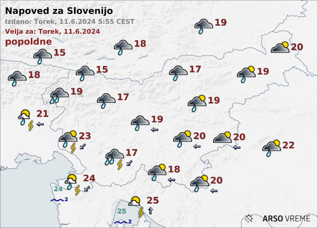 Popoldne bo dež oslabel in marsikje prehodno ponehal. Najvišje dnevne temperature bodo od 15 do 20, na Primorskem okoli 24 stopinj Celzija.