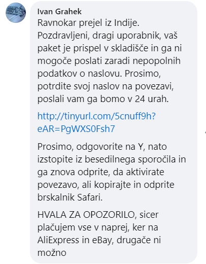 Slednja nagovarjajo uporabnike, da vnesejo podatke o naslovu, ki naj bi bil nepopoln, saj so njihov paket prejeli v skladišče. Tega naj bi nato odposlali v 24 urah.