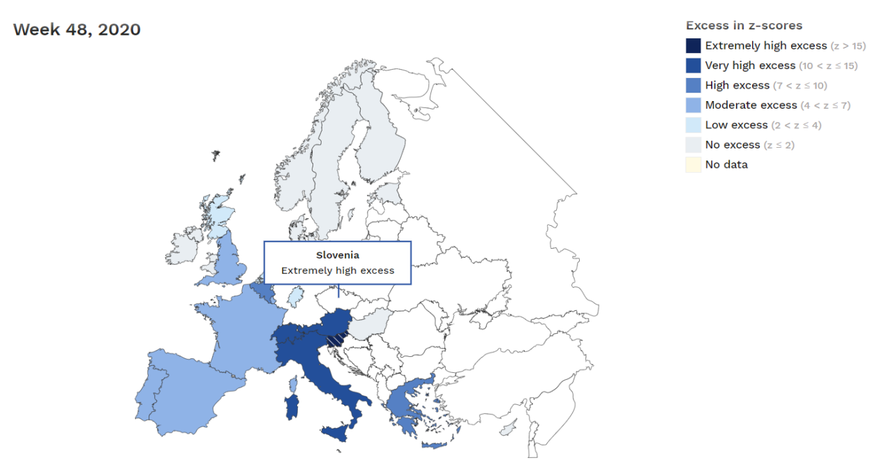 Slovenija je namreč v 48. tednu letošnjega leta država na evropskem zemljevidu, ki je obarvana najbolj temno modro. S tem smo uvrščeni v kategorijo, kjer je bil 'ekstremno visok delež presežnih smrti'.