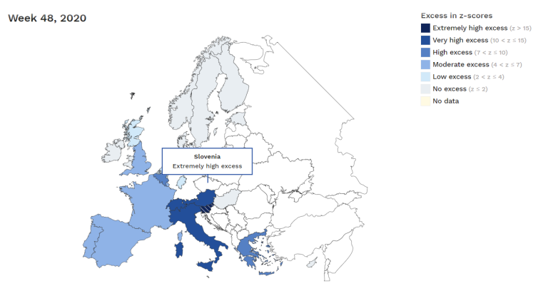 Slovenija je namreč v 48. tednu letošnjega leta država na evropskem zemljevidu, ki je obarvana najbolj temno modro. S tem smo uvrščeni v kategorijo, kjer je bil 'ekstremno visok delež presežnih smrti'.