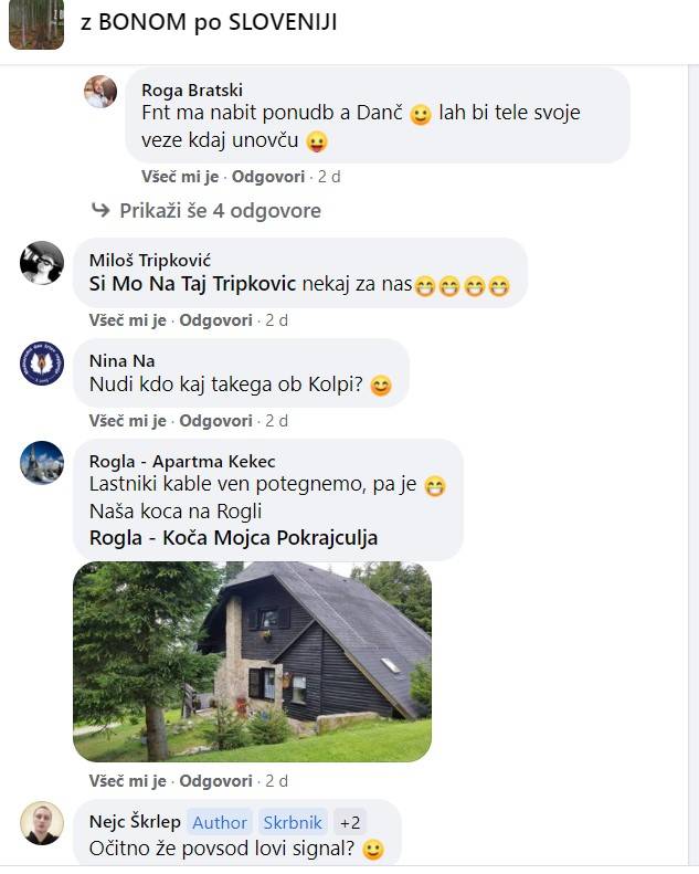 Prav v tej skupini pa je moč najti objavo, ki nagovarja k debati ponudnike in povpraševalce »namestitvenih objektov, kjer signal (mobilni in Wi-Fi) ne doseže naših telefonov.«