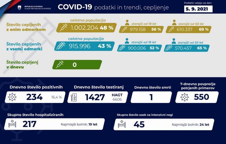 V Sloveniji so včeraj, 5. septembra, opravili 1427 PCR testiranj na koronavirus in potrdili 234 novih okužb, gre za 16,4-odstotni delež okužb.