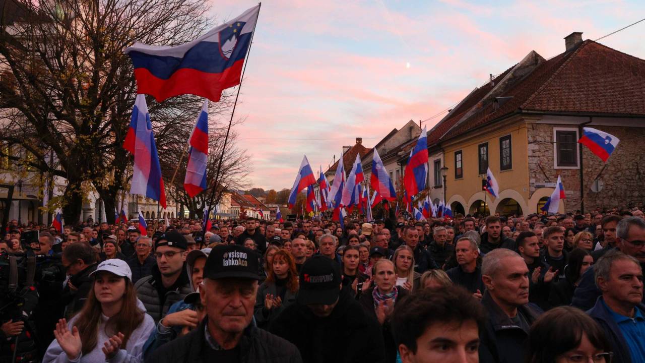 Na Glavnem trgu v Novem mestu občani spremljajo prenos izredne seje občinskega sveta. Župan Gregor Macedoni poudarja pomen dialoga in sodelovanja z državo pri razvoju mesta.