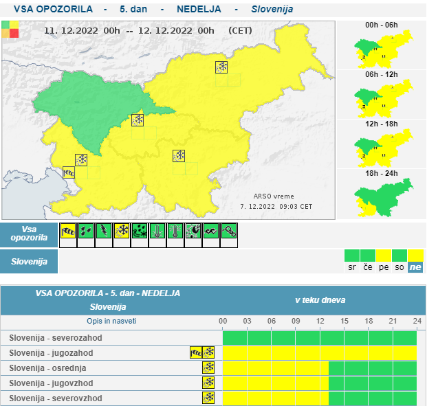 Prav tako pa je zaradi napovedanega snega rumeno opozorilo izdano tudi za nedeljo, in sicer za celotno državo, z izjemo severozahodne Slovenije.
