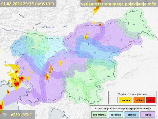 Zaradi neviht je Agencija za okolje za danes izdala oranžno opozorilo za vso državo. Prve nevihte so dele severne in osrednje Slovenije zajele že zgodaj popoldne. Ponekod je padala tudi toča. Portal Neurje.si poroča o pojavu toče v Dolgi vasi, Šentlovencu, Biču. Toča je danes pobelila tudi Kredarico.