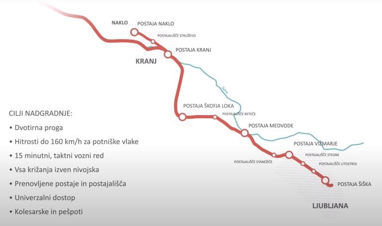 Predvidena je rekonstrukcija postaje Šiška pred prečkanjem Drenikove ulice. Nato trasa poteka po razširjenem nadvozu preko Drenikove ulice, kjer se odcepi nova dvotirna železniška proga proti Kamniku, ter nadaljuje mimo železniških postajališč Litostroj in Stegne ter postaje Vižmarje naprej proti severu, kjer bo predvidoma zgrajeno železniško postajališče Stanežiče, ki bo nadomestilo postajališče Medno in omogočilo navezavo na parkirišče P+R.