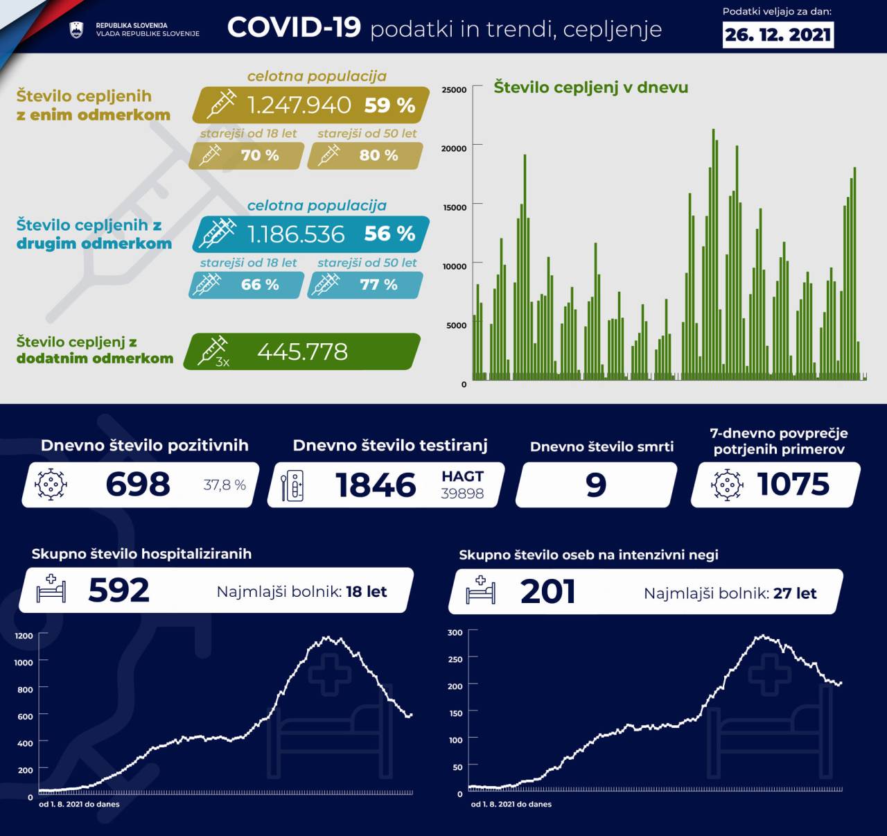 Trenutno je po podatkih Covid-19 Sledilnika v bolnišnicah hospitaliziranih 592 covidnih pacientov, od tega je 201 pacientov na intenzivni negi.