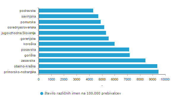 V Pomurju je najpopularnejše žensko ime Marija, moško pa Jožef. Daljša različica najpogostejšega imena v državi tako tudi pomursko regijo uvršča med tiste »manj izvirne.« V obalno-kraški regiji je zanimivo na prvem mestu ime Marko, Franc pa komaj na 32. mestu. Na Koroškem je največ Ivanov, v Posavju Jožetov. Marija in Ana sta ženski imeni, ki sta najpogostejši v čisto vsaki posamezni regiji.
