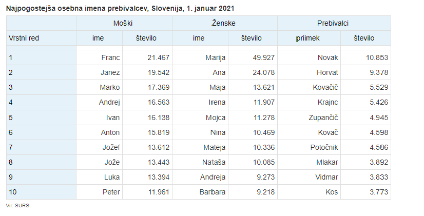 Čeprav imeni Marija in Franc upadata v rabi, sta vseeno še vedno najpogostejši imeni pri nas. Marije se nekoliko bolje ohranjajo v sodobnosti, verjetno tudi zaradi Bibljiske vloge imena. Ženskim imenom po pogostosti sledi Ana, moškim pa Jože in Janez. Med priimki prednjačita Novak in Horvat.
