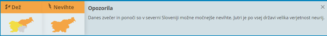 Agencija Republike Slovenije za okolje je zaradi možnih močnejših neviht zvečer in ponoči za sever Slovenije izdala oranžno opozorilo, jutri pa je po vsej državi velika verjetnost neurij.