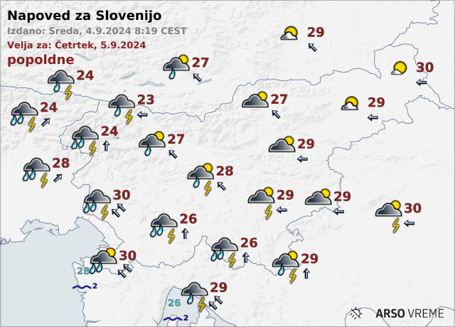 Sredi dneva lahko v zahodnih krajih pričakujemo prve plohe in nevihte, ki se bodo nato širile proti osrednji Sloveniji. Ob morju bo zapihal jugo, kar bo še dodatno poslabšalo vremenske razmere.