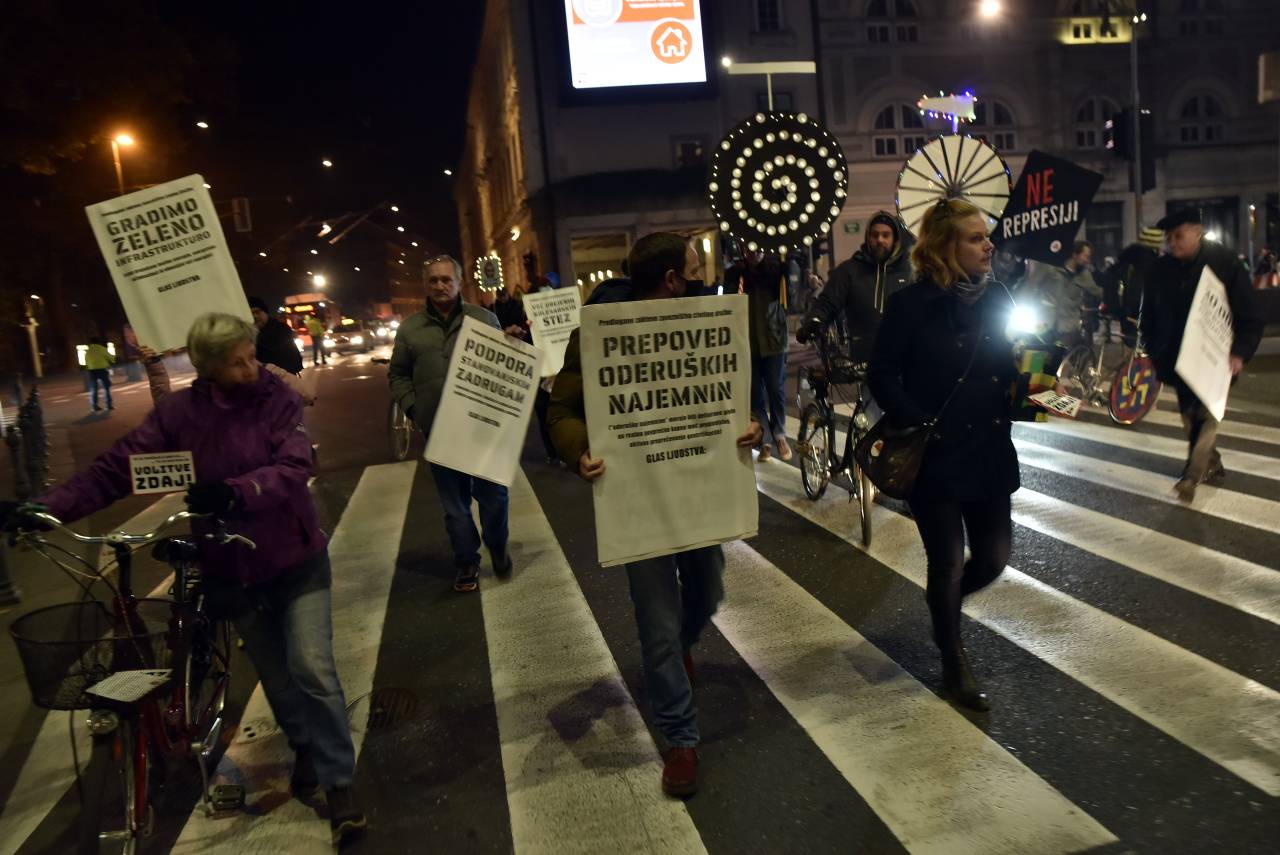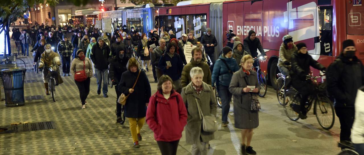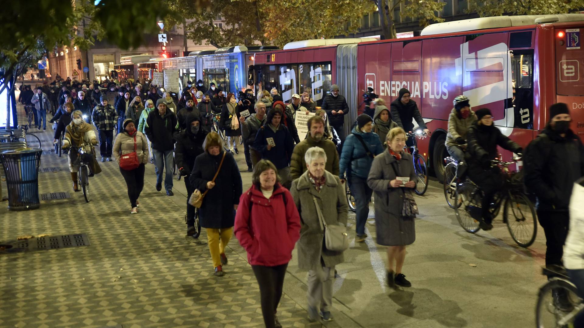 Na Trgu republike v Ljubljani so se danes ob 19. uri zbrali petkovi protestniki, ki so tokrat naslovili problematiko infrastrukture, zelene mobilnosti, javnega potniškega prometa in stanovanj.