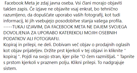 Na Facebooku so v zadnjem času začele množično krožiti lažne objave, s katerimi naj bi posamezniki družbi Meta prepovedovali uporabo osebnih podatkov in fotografij.