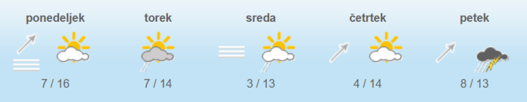 Najnižje jutranje temperature bodo od 4 do 11, v alpskih dolinah malo nad 0, najvišje dnevne od 9 do 14, na Primorskem in na jugovzhodu do 18 stopinj Celzija.